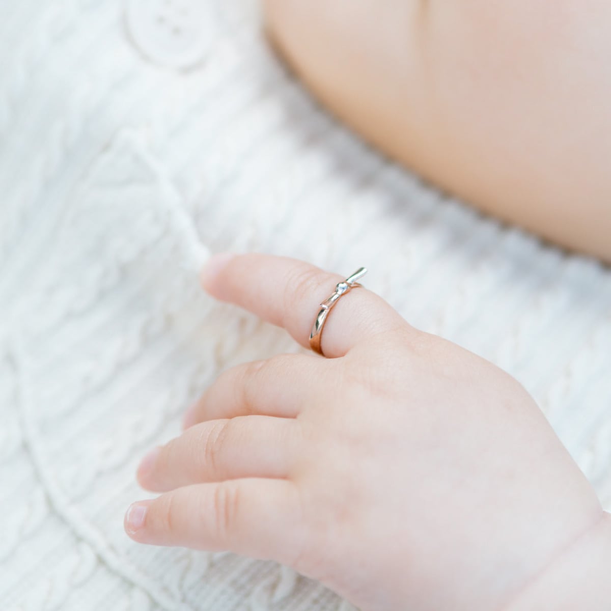 このベビーリングはお子さまに出会えたご縁を、キュッと結んだ結び目にあらわしています。